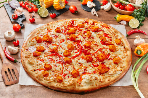 Куриные кусочки в хрустящей панировке, лук и сладкий болгарский перчик под нежным сыром пармезан.