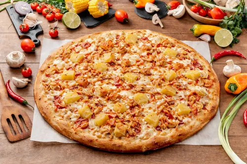 Куриные кусочки, ананас, сладкий соус чили, моцарелла, фирменная томатная основа.